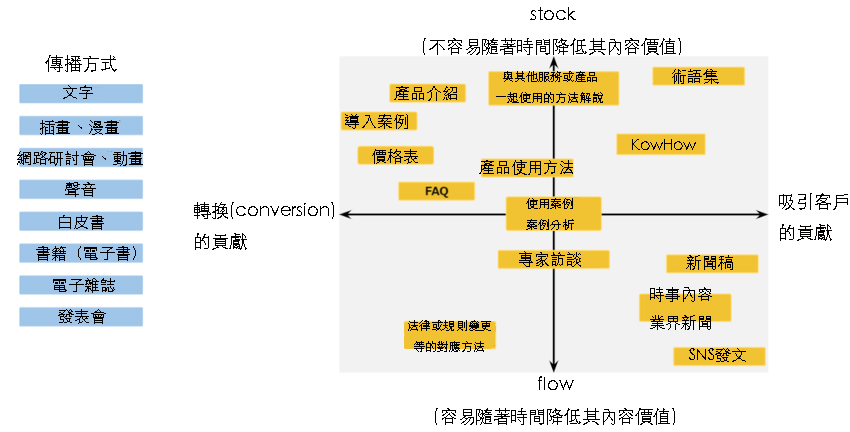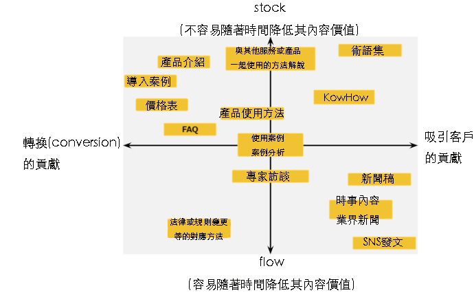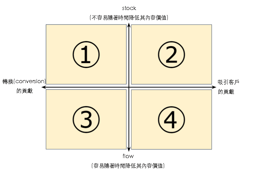內容種類可分類為如上圖,縱軸(Y軸)是stock和flow,橫軸(X軸)是轉換(Conversion)和集客(吸引客戶)。